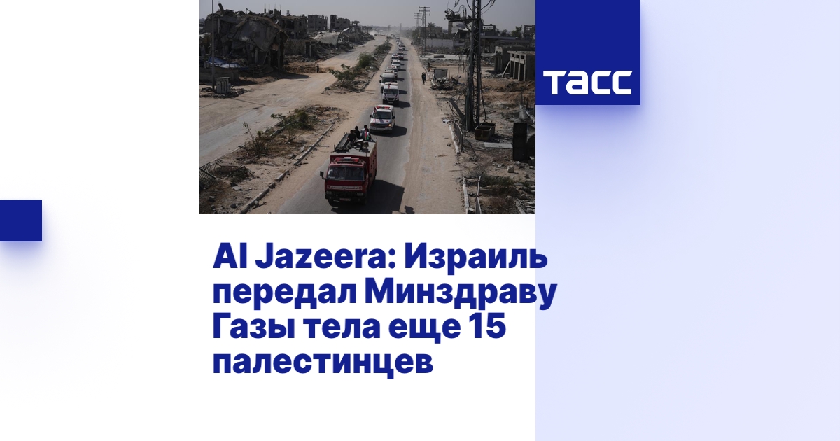 КАИР, 5 ноября. /ТАСС/. Власти Израиля в соответствии с соглашением с палестинским движением ХАМАС передали Минздраву сектора Газа останки еще 15 погибших палестинцев. Об этом сообщил катарский телеканал .