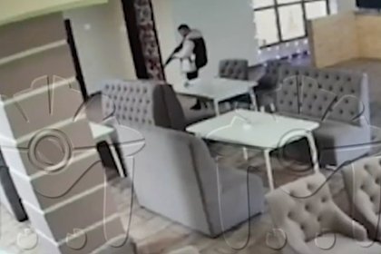 На кадрах виден шатающийся мужчина, который стреляет в кафе, падает, затем видны взрывы. Посетитель прячется под стол. Спецназ обезвредил мужчину, он связанный лежит на полу, показан автомат.
