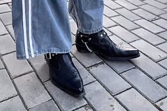 Юзерша запечатлела мужчину, который надел свободные джинсы с лампасами, дутую удлиненную куртку и бежевую кофту. В качестве обуви герой ролика выбрал черные туфли на каблуке и с удлиненным носом, декорированные серебряными цепями. «Что вы знаете о стиле?» — подписала Надежда.