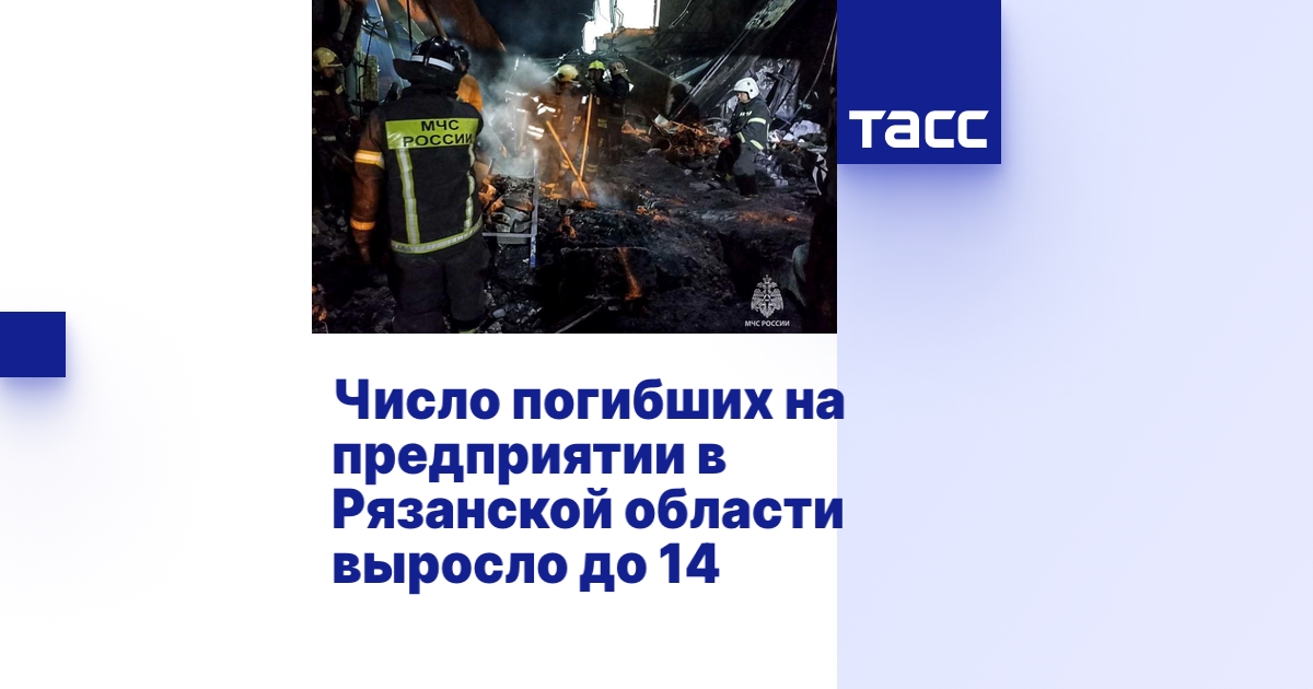 МОСКВА, 17 августа. /ТАСС/. Число погибших на предприятии в Рязанской области увеличилось до 14 человек, 135 пострадали. Об этом сообщает пресс-служба МЧС России.