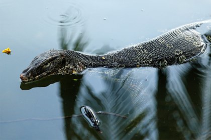 Ранее , что в сингапурском ботаническом саду варан растерзал черепаху на глазах у черного лебедя. Заметив птицу, варан уставился на нее, как будто пытался запугать. После этого лебедь уплыл.