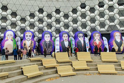 Инсталляцию привезла радиостанция «Русское радио». Матрешки украшены изображениями популярных артистов.