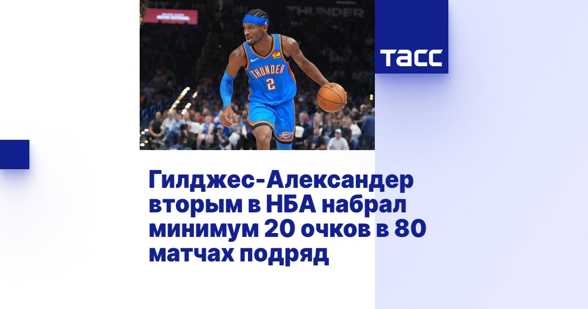 ВАШИНГТОН, 5 ноября. /ТАСС/. Канадский разыгрывающий "Оклахомы" Шей Гилджес-Александер стал вторым игроком в истории Национальной баскетбольной ассоциации (НБА), который набрал минимум 20 очков в 80 матчах подряд.