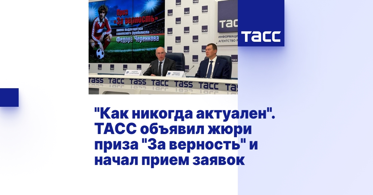 МОСКВА, 25 августа. /ТАСС/. Генеральный директор ТАСС Андрей Кондрашов на пресс-конференции в агентстве объявил состав жюри приза "За верность" имени бывшего футболиста московского "Спартака" и сборной СССР Федора Черенкова, его возглавил министр спорта РФ Михаил Дегтярев. Прием заявок от соискателей приза начался с сегодняшнего дня.