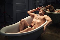 Мужчина предстал перед камерой, лежа в ванне под хрустальной люстрой. Он позировал обнаженным с короной на голове, прикрыв тело лепестками цветов.