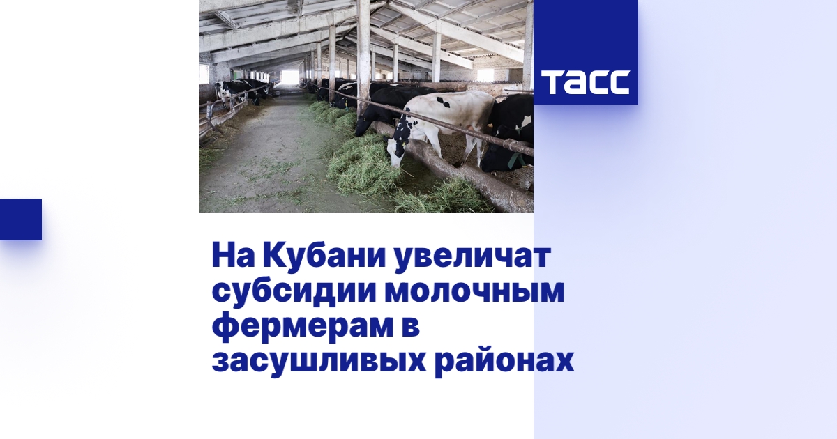 КРАСНОДАР, 19 августа. /ТАСС/. Власти Краснодарского края увеличат субсидии для молочных фермерских хозяйств, пострадавших от засухи, размер поддержки составит шесть рублей за килограмм молока, тогда как для остальных сохранится субсидия в четыре рубля.