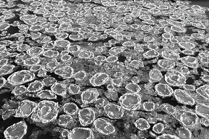 На опубликованном фото у берега реки лед поделен на диски разного диаметра с приподнятыми краями, которые напоминают по форме блины.