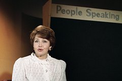 Ведущая Светлана Жильцова задает вопрос участникам команды Риги во время телевизионной передачи «КВН».. Фото: Борис Кавашкин / РИА Новости