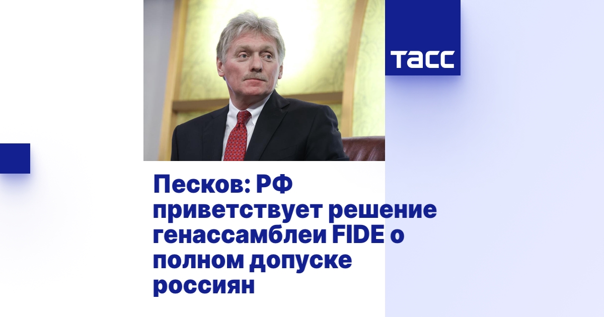 МОСКВА, 14 декабря. /ТАСС/. Россия приветствует решение генассамблеи Международной шахматной федерации (FIDE) в пользу полного допуска российских шахматистов к международным соревнованиям с флагом и гимном. Об этом заявил журналистам пресс-секретарь президента России, председатель попечительского совета Федерации шахмат России (ФШР) Дмитрий Песков.