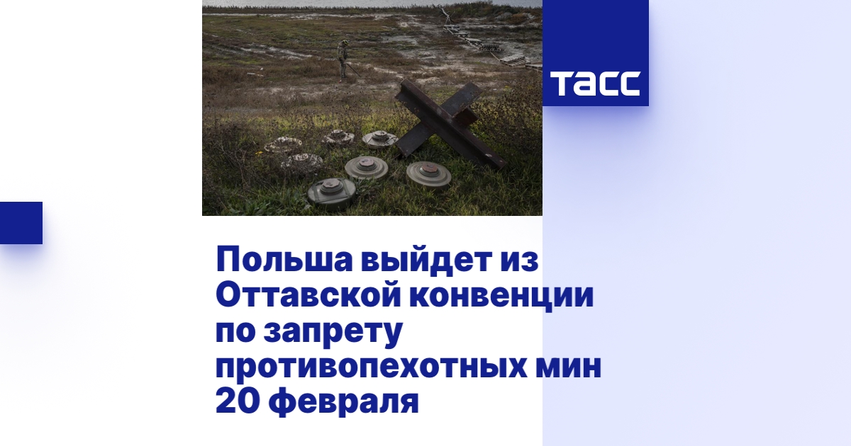 МОСКВА, 16 января. /ТАСС/. Польша официально выйдет из Оттавской конвенции о запрете использования, производства и хранения противопехотных мин 20 февраля. Об этом сообщил в эфире радиостанции замглавы польского Минобороны Цезарий Томчик.