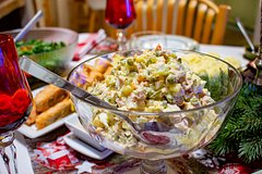 По словам врача, без вреда для здоровья за один прием пищи можно съесть 100-150 граммов оливье, что соответствует примерно трем-четырем столовым ложкам салата без большой горки. Оптимальной порцией селедки под шубой она назвала примерно 120 граммов, то есть две-три столовые ложки.