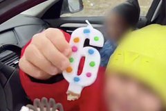 На видео сначала ребенок на иномарке подъезжает ближе к камере, открывает окно и ставит свечку с цифрой шесть в кусок торта. После чего окно закрывается, и мальчик едет дальше. Кстати, в кадр попадает еще один ребенок, сидящий на пассажирском сиденье рядом с юным водителем.