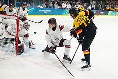 В начале третьей минуты первого периода счет в матче открыл немец Лукас Райхель. Сборная Латвии отыгралась усилиями Данса Лочмелиса. Германия ушла на первый период в ранге лидера — отличился . Далее латвийцы забросили три шайбы за авторства Лочмелиса, Эдуарда Тралмакса и Ренарса Крастенбергса. Тим Штюцле за две с половиной минуты до конца поединка забил третий гол немцев.