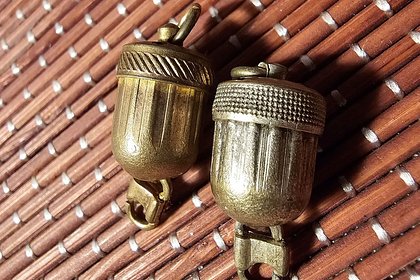 Пользователь с ником EquanimousKruppe выложил на портале снимки необычной парной вещи, обнаруженной им на блошином рынке в немецком Гамбурге. На них изображены два маленьких латунных предмета в форме колокольчиков с пружинными выдвижными шипами.