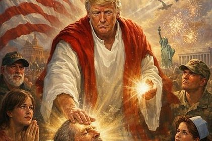 Ранее Трамп изображение, на котором он представлен в виде фигуры, напоминающей Иисуса Христа. На картинке американский лидер одет в белый хитон. Одной рукой он прикасается к лежащему мужчине в больничной рубашке, а из его ладоней исходит свет. На картинке Трампа окружают американский военный, медсестра и молящаяся женщина, а на заднем фото изображены американский флаг, белоголовый орлан, статуя Свободы, истребители и фейерверк.