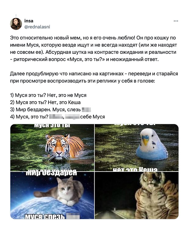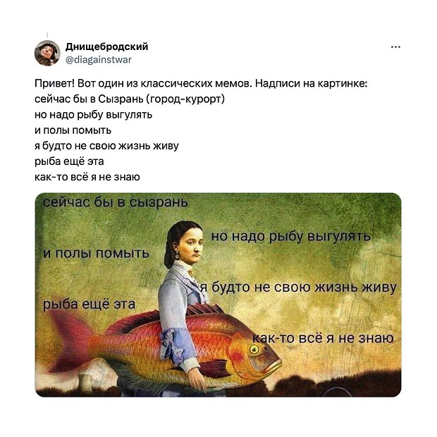 Публикация набрала сотни тысяч просмотров, а россияне начали охотно делиться контентом. Марко мем про необходимость выгуливать рыбу вместо поездки в Сызрань, после чего с Мусей — потерявшейся кошкой из скетча YouTube-блогера Батька (настоящее имя — Раис Юсупов).