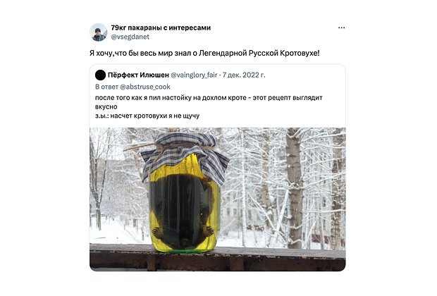 Куда сложнее получилось с кротовухой — завирусившейся несколько лет назад настойкой, которую россияне якобы пьют в качестве алкогольного напитка. Заботливо на глобальный уровень одним из отечественных пользователей, она спровоцировала волну искреннего изумления.