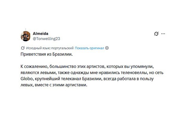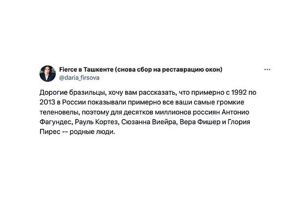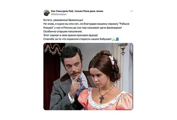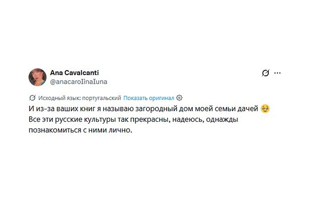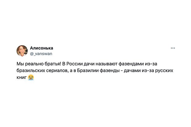 Следом бразильцев историей о том, что благодаря их кинематографу дачи в России называют фазендами, однако на это прилетела ответная реакция: выяснилось, что в самой фазенды порой дачами, но уже благодаря русской классике.