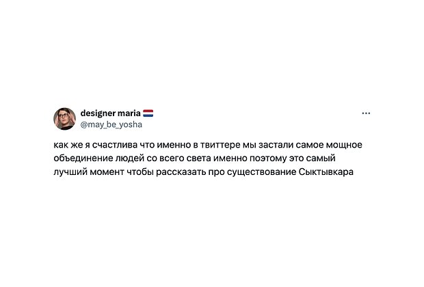 Как же я счастлива, что именно в твиттере мы застали самое мощное объединение людей со всего света — именно поэтому это самый лучший момент, чтобы рассказать про существование Сыктывкара