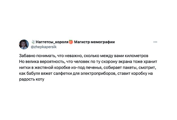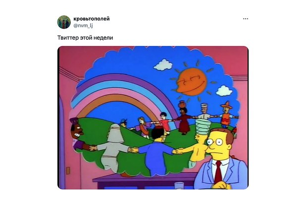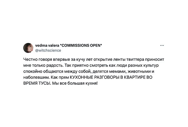«Честно говоря, впервые за кучу лет открытие ленты твиттера приносит мне только радость. Так приятно смотреть, как люди разных культур спокойно общаются между собой, делятся мемами, животными и наболевшим. [Прямо как будто] это кухонные разговоры в квартире во время тусы. Мы все — большая кухня!» — еще один пользователь X.