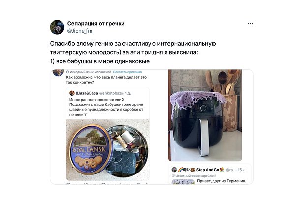 «Вавилонский твиттер» стал возможным благодаря функции автоматического перевода публикаций, внедренной в X. Упрощение межкультурной коммуникации уничтожило языковые барьеры между пользователями, поэтому они принялись за то, что удается им лучше всего — начали обмениваться мемами.