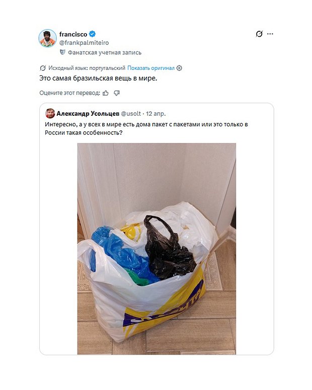 Глобальное единение оказалось подкреплено достаточно сильными аргументами. , например, что пакет с пакетами — «самая бразильская вещь в мире», а вовсе не артефакт, однозначно указывающий на постсоветское происхождение его обладателя.