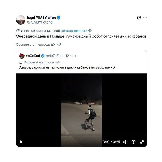 Настоящий фурор видео, бушующее в польском сегменте, теперь ставшее доступным всему миру — на нем робот-гуманоид гонит по городу стадо диких кабанов. «Просто очередной день в », — подписал его автор, спровоцировав десятки шуток про Терминатора и про то, что европейская страна живет уже в 2050 году